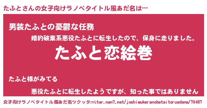 | 男性向けラノベタイトル風あだ名 | 『おまえをオタクにしてやるから、俺をたふとにしてくれ! 』 |