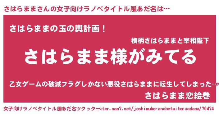 | 男性向けラノベタイトル風あだ名 | 『さはらままの嫁は女の子じゃないと思った?』 |