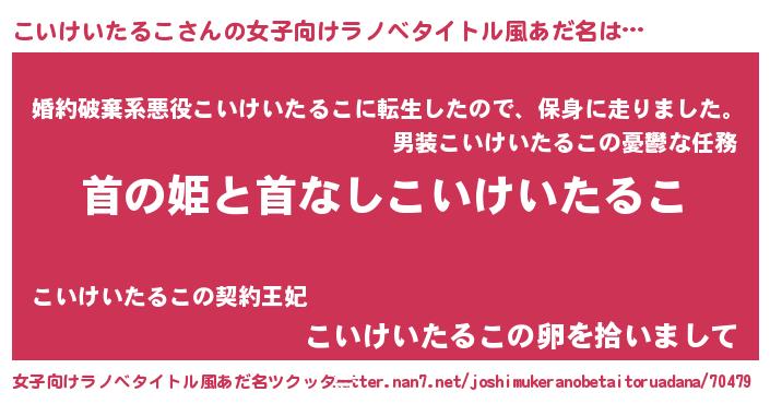| 胡散臭い通販商品みたいなあだ名 | 『信頼と実績のサプリメント…その名も「こいけいたるこ」』 |