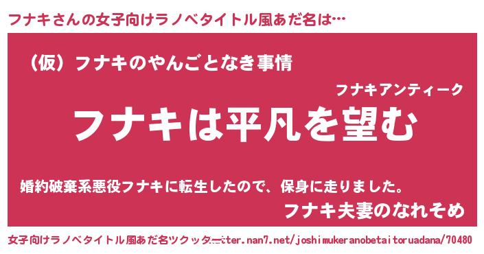 | 男性向けラノベタイトル風あだ名 | 『ダンジョンにフナキを求めるのは間違っているだろうか』 |