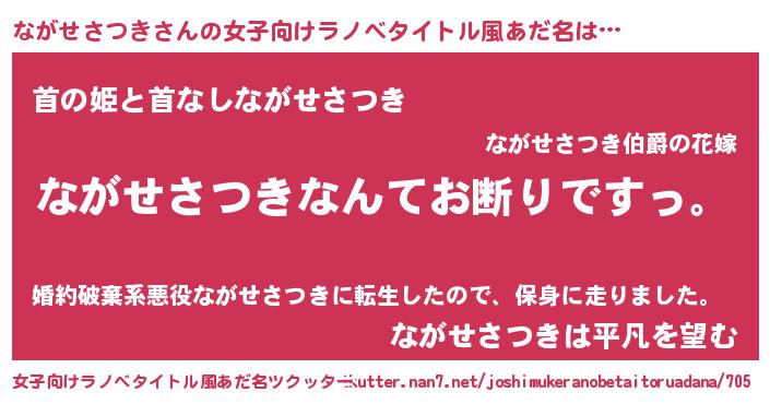 ながせさつきさんの女子向けラノベタイトル風あだ名は… 『ながせさつきなんてお断りですっ。』『首の姫と首なしながせさつき』『ながせさつきは平凡を望む』 ツクッター #女子向けラノベタイトル風あだ名ツクッター http://tkutter.nan7.net/joshimukeranobetaitoruadana/705/