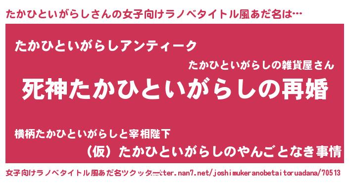| 男性向けラノベタイトル風あだ名 | 『ノーゲーム・ノータカヒトイガラシ』 |