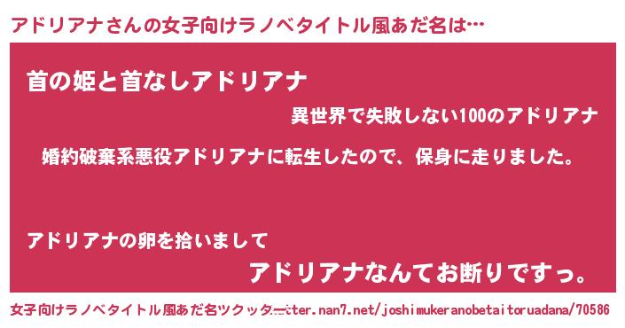 アドリアナさんの女子向けラノベタイトル風あだ名は… 『婚約破棄系悪役アドリアナに転生したので、保身に走りました。』『首の姫と首なしアドリアナ』『アドリアナなんてお断りですっ。』 ツクッター #女子向けラノベタイトル風あだ名ツクッター http://tkutter.nan7.net/joshimukeranobetaitoruadana/70586/