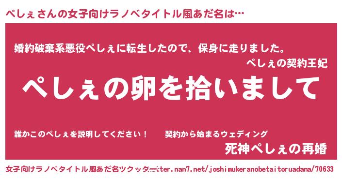| 男性向けラノベタイトル風あだ名 | 『ダンジョンにぺしぇを求めるのは間違っているだろうか』 |
