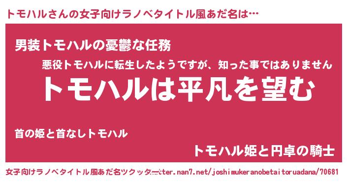 | 男性向けラノベタイトル風あだ名 | 『ダンジョンにトモハルを求めるのは間違っているだろうか』 |