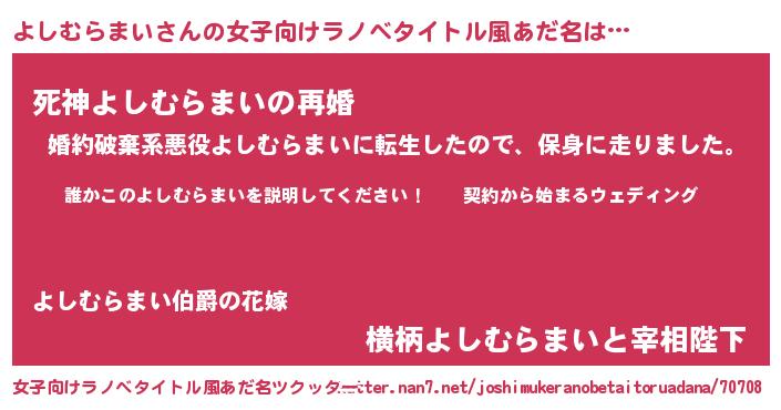 | 肩書あだ名 | 『よしむらまいCEO』『よしむらまい助教授』 |