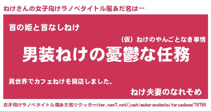 | 男性向けラノベタイトル風あだ名 | 『うちのねけが世界を掌握している!』 |