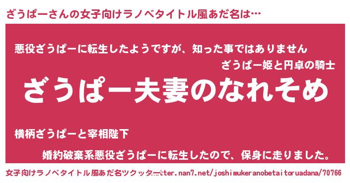 | 男性向けラノベタイトル風あだ名 | 『おまえをオタクにしてやるから、俺をざうぱーにしてくれ! 』 |