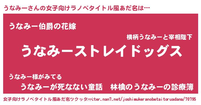 | 男性向けラノベタイトル風あだ名 | 『Re:うなみーから始める異世界生活』 |