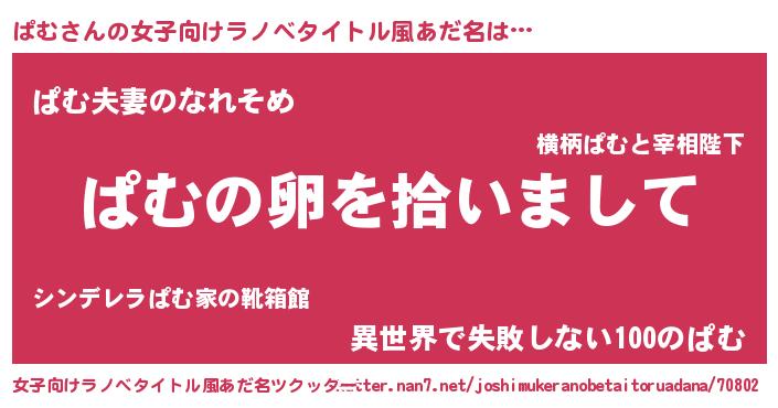 | 男性向けラノベタイトル風あだ名 | 『ダンジョンにぱむを求めるのは間違っているだろうか』 |