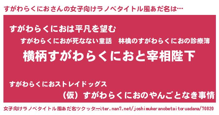 | 男性向けラノベタイトル風あだ名 | 『すがわらくにおに滅ぼされるだけの簡単なお仕事です』 |
