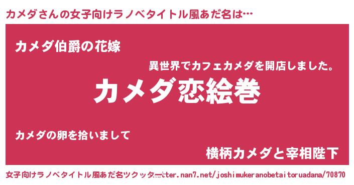 | 男性向けラノベタイトル風あだ名 | 『おまえをオタクにしてやるから、俺をカメダにしてくれ! 』 |