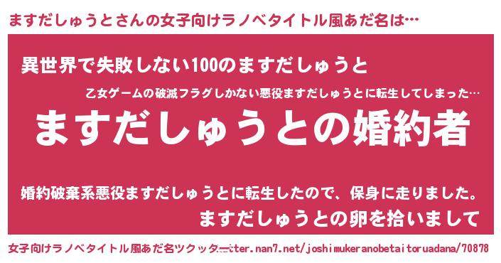ますだしゅうとさんの女子向けラノベタイトル風あだ名は… 『ますだしゅうとの婚約者』『異世界で失敗しない100のますだしゅうと』『ますだしゅうとの卵を拾いまして』 ツクッター #女子向けラノベタイトル風あだ名ツクッター http://tkutter.nan7.net/joshimukeranobetaitoruadana/70878/