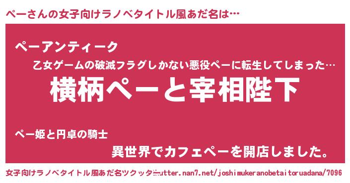 | 男性向けラノベタイトル風あだ名 | 『ぺーに滅ぼされるだけの簡単なお仕事です』 |