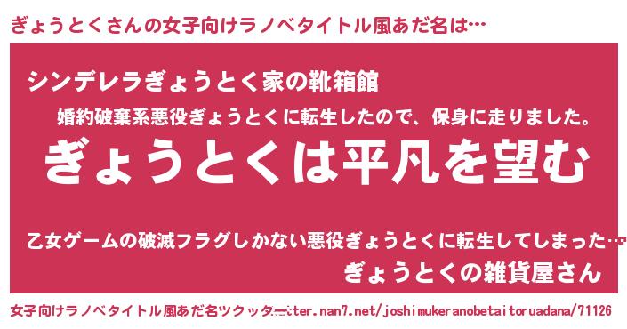 | 胡散臭い通販商品みたいなあだ名 | 『信頼と実績のペンダント…その名も「ぎょうとく」』 |