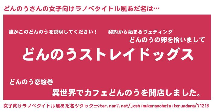 | 男性向けラノベタイトル風あだ名 | 『Re:どんのうから始める異世界生活』 |