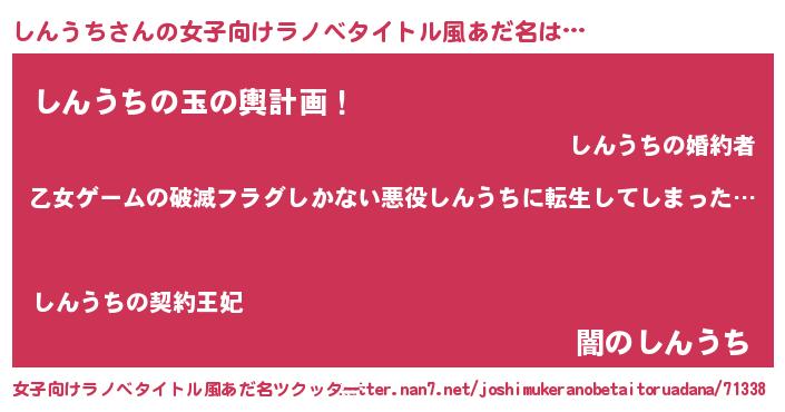| 男性向けラノベタイトル風あだ名 | 『この素晴らしい世界にしんうちを!』 |