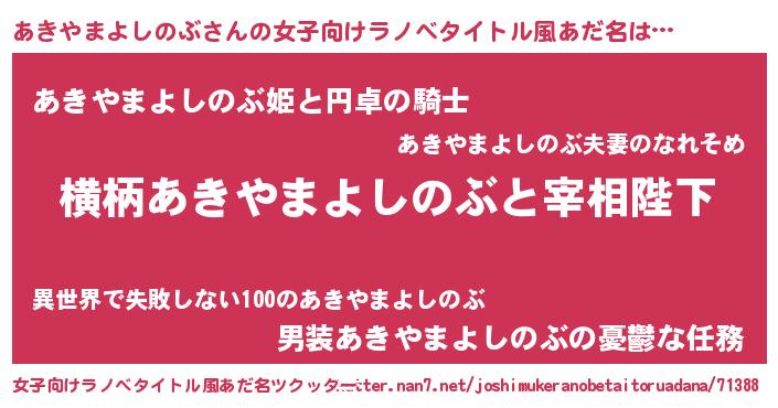 | 男性向けラノベタイトル風あだ名 | 『あきやまよしのぶに滅ぼされるだけの簡単なお仕事です』 |