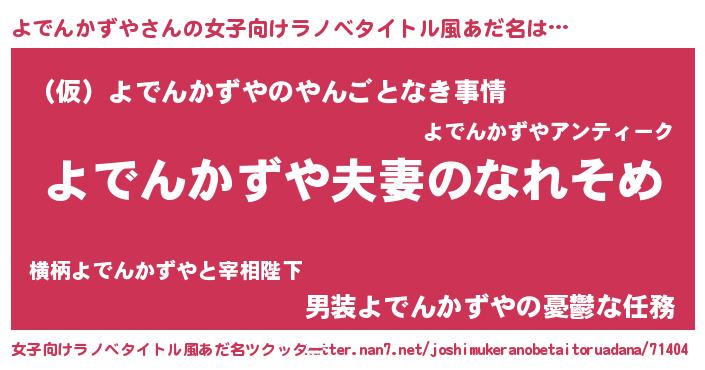 | 男性向けラノベタイトル風あだ名 | 『おまえをオタクにしてやるから、俺をよでんかずやにしてくれ! 』 |