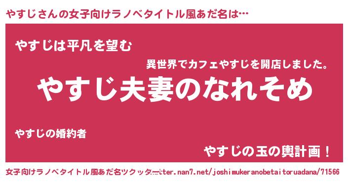 | 男性向けラノベタイトル風あだ名 | 『おまえをオタクにしてやるから、俺をやすじにしてくれ! 』 |