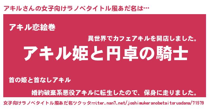 | 男性向けラノベタイトル風あだ名 | 『アキルの憂鬱』『アキルスレイヤー』 |