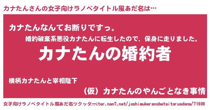 | 男性向けラノベタイトル風あだ名 | 『うちの娘の為ならば、俺はもしかしたらカナたんも倒せるかもしれない。』 |