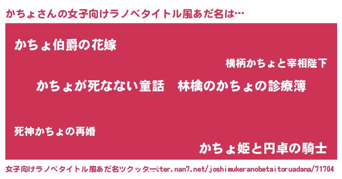 | 男性向けラノベタイトル風あだ名 | 『魔弾の王とかちょ』『かちょの憂鬱』 |