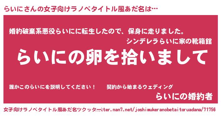 | 男性向けラノベタイトル風あだ名 | 『ダンジョンにらいにを求めるのは間違っているだろうか』 |