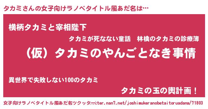 | 男性向けラノベタイトル風あだ名 | 『タカミの憂鬱』『魔弾の王とタカミ』 |