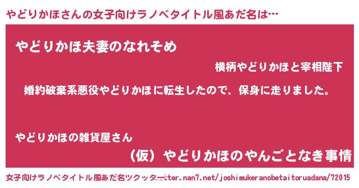 | 男性向けラノベタイトル風あだ名 | 『ヤドリカホスレイヤー』 |