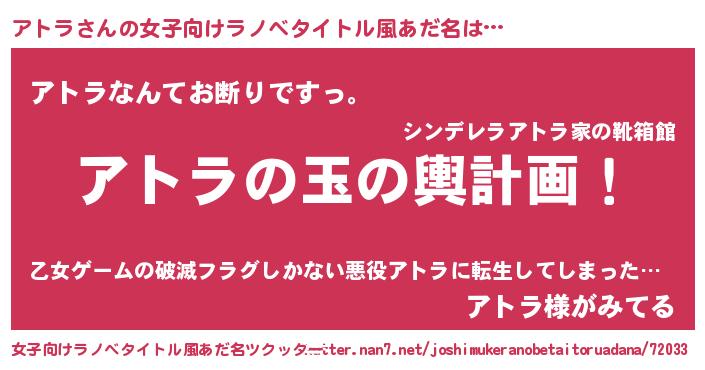 | 男性向けラノベタイトル風あだ名 | 『転生したらアトラだった件』 |