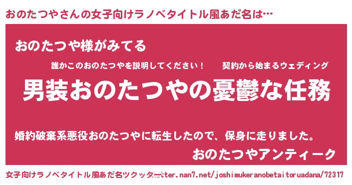 おのたつやさんの女子向けラノベタイトル風あだ名は… 『男装おのたつやの憂鬱な任務』『おのたつや様がみてる』『おのたつやアンティーク』 ツクッター #女子向けラノベタイトル風あだ名ツクッター http://tkutter.nan7.net/joshimukeranobetaitoruadana/72317/