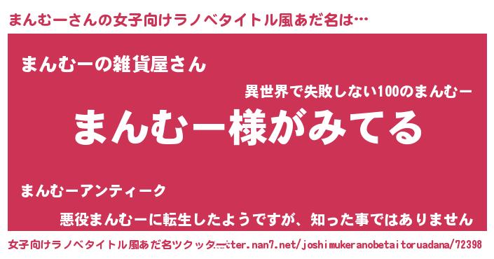 | 男性向けラノベタイトル風あだ名 | 『まんむーの嫁は女の子じゃないと思った?』 |