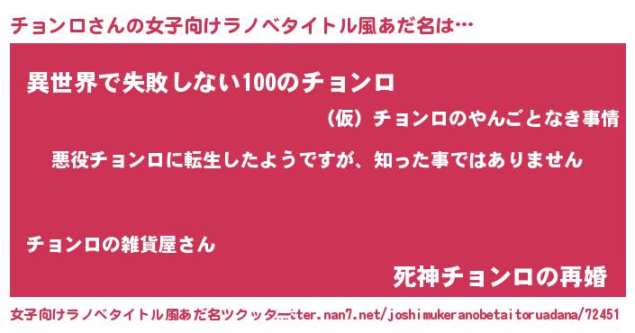 | 男性向けラノベタイトル風あだ名 | 『この素晴らしい世界にチョンロを!』 |