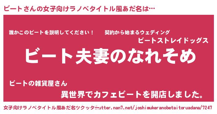 | 男性向けラノベタイトル風あだ名 | 『おまえをオタクにしてやるから、俺をビートにしてくれ! 』 |