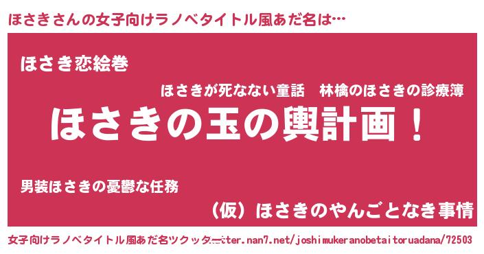 ほさきさんの女子向けラノベタイトル風あだ名は… 『ほさきの玉の輿計画!』『ほさき恋絵巻』『(仮)ほさきのやんごとなき事情』 ツクッター #女子向けラノベタイトル風あだ名ツクッター http://tkutter.nan7.net/joshimukeranobetaitoruadana/72503/