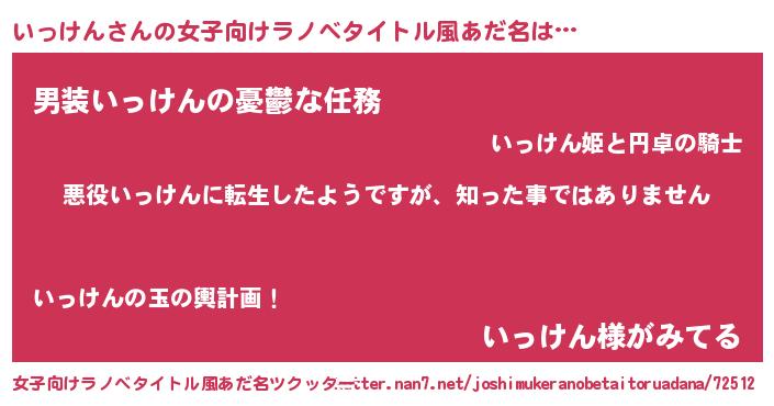 | 男性向けラノベタイトル風あだ名 | 『この素晴らしい世界にいっけんを!』 |