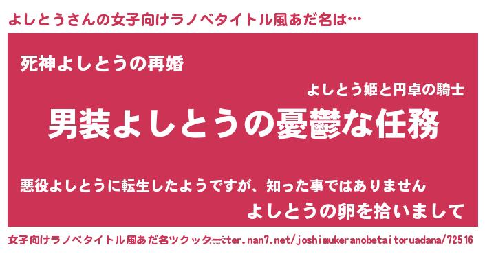 | 男性向けラノベタイトル風あだ名 | 『うちのよしとうが世界を掌握している!』 |