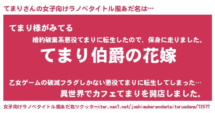 | 男性向けラノベタイトル風あだ名 | 『うちの娘の為ならば、俺はもしかしたらてまりも倒せるかもしれない。』 |
