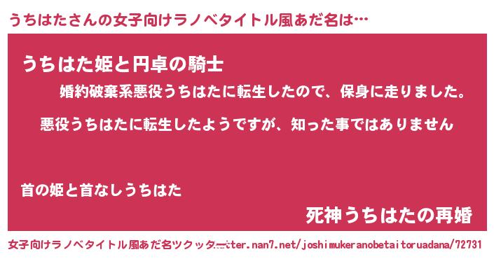 | 男性向けラノベタイトル風あだ名 | 『この素晴らしい世界にうちはたを!』 |