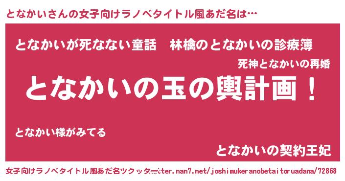 | 男性向けラノベタイトル風あだ名 | 『となかい~年齢イコール彼女いない歴の魔法使い~』 |