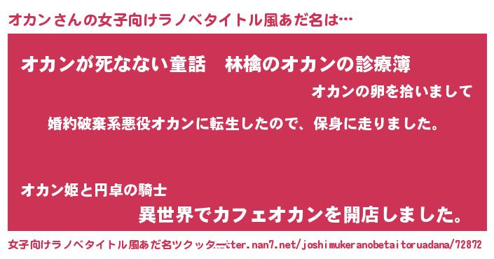 | 男性向けラノベタイトル風あだ名 | 『オカンスレイヤー』『魔弾の王とオカン』 |