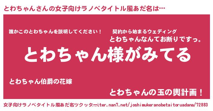 | 男性向けラノベタイトル風あだ名 | 『とわちゃんの嫁は女の子じゃないと思った?』 |