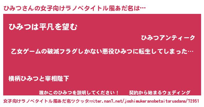 | 男性向けラノベタイトル風あだ名 | 『この素晴らしい世界にひみつを!』 |