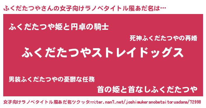 | 男性向けラノベタイトル風あだ名 | 『Re:ふくだたつやから始める異世界生活』 |