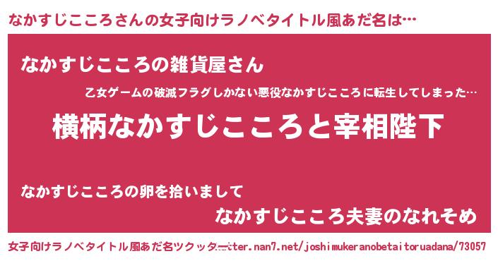 なかすじこころさんの女子向けラノベタイトル風あだ名は… 『横柄なかすじこころと宰相陛下』『なかすじこころの雑貨屋さん』『なかすじこころ夫妻のなれそめ』 ツクッター #女子向けラノベタイトル風あだ名ツクッター http://tkutter.nan7.net/joshimukeranobetaitoruadana/73057/