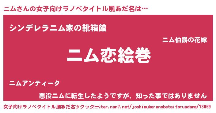 | 男性向けラノベタイトル風あだ名 | 『おまえをオタクにしてやるから、俺をニムにしてくれ! 』 |