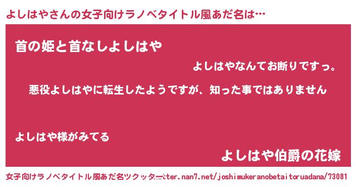 | 男性向けラノベタイトル風あだ名 | 『この素晴らしい世界によしはやを!』 |