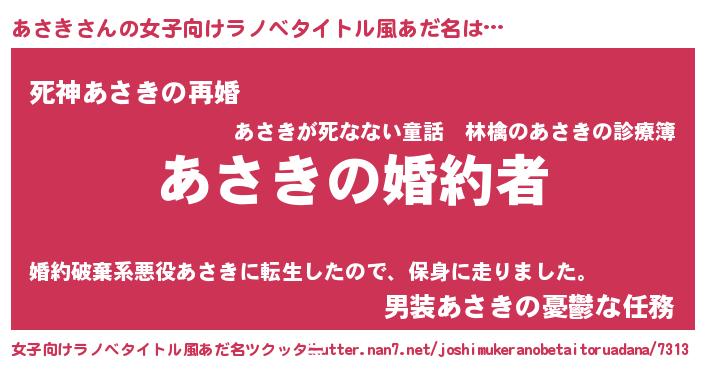 | 男性向けラノベタイトル風あだ名 | 『うちの娘の為ならば、俺はもしかしたらあさきも倒せるかもしれない。』 |