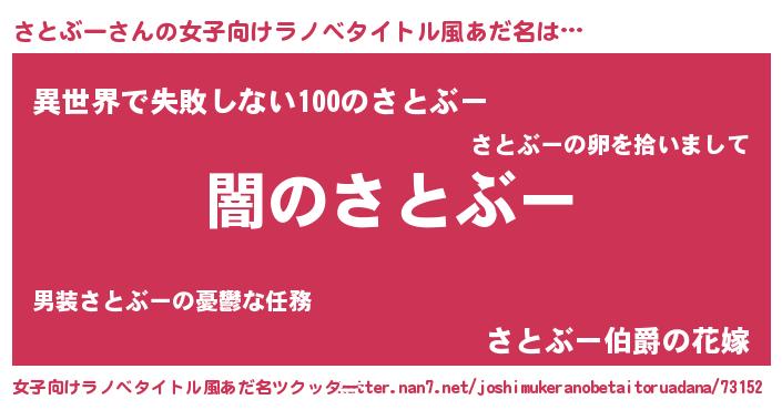 | 男性向けラノベタイトル風あだ名 | 『Re:さとぶーから始める異世界生活』 |